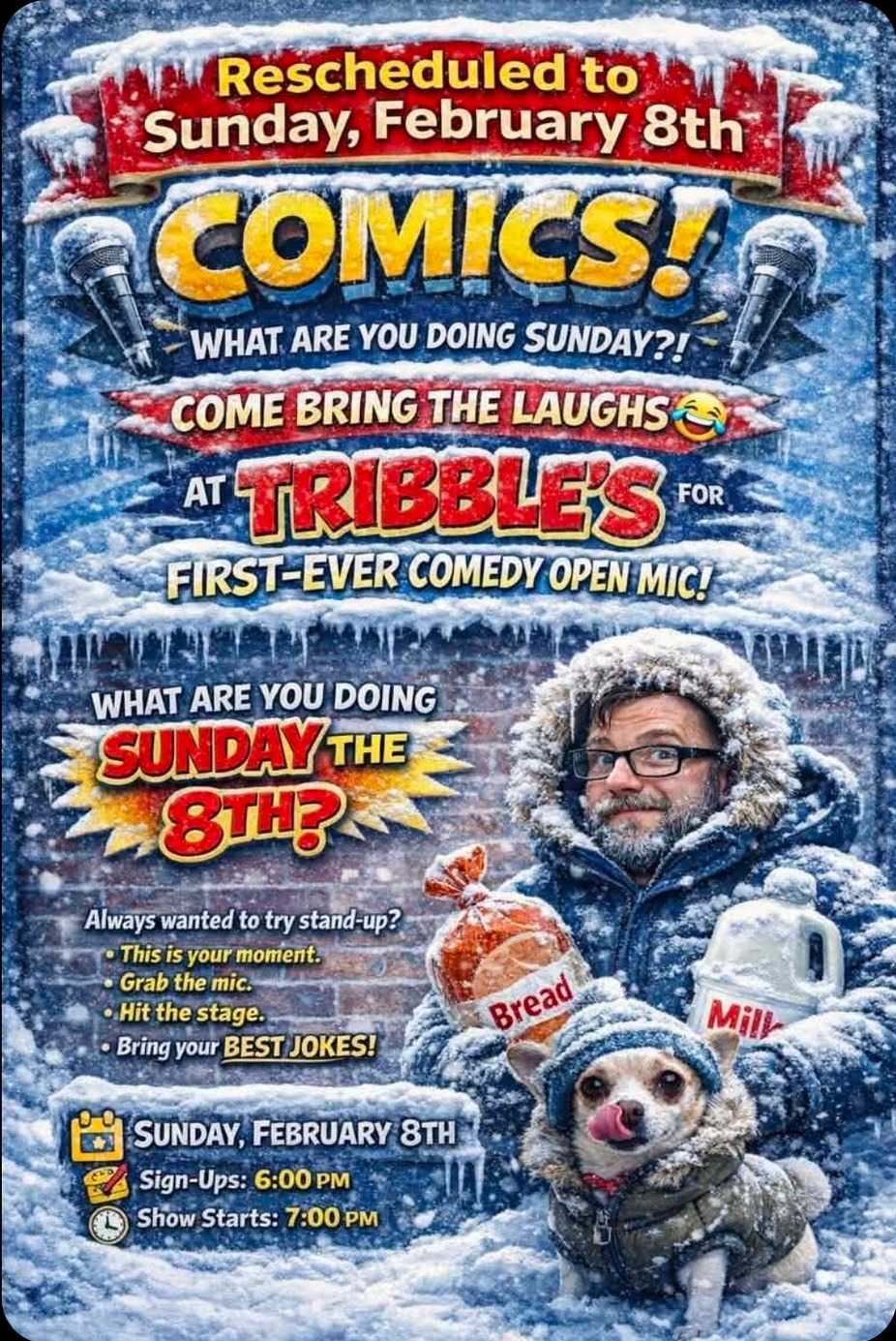 COMICS! What are you doing Sunday?! COME BRING THE LAUGHS at Tribble’s for our FIRST-EVER Comedy Open Mic! Always wanted to try stand-up? This is your moment. Grab the mic. Hit the stage. Bring your BEST JOKES. Sunday, February 8th Sign-ups: 6 PM Show starts: 7:00 PM Hosted by Chris Wilson New comics • Seasoned comics • Brave first-timers Let’s laugh at Tribble’s